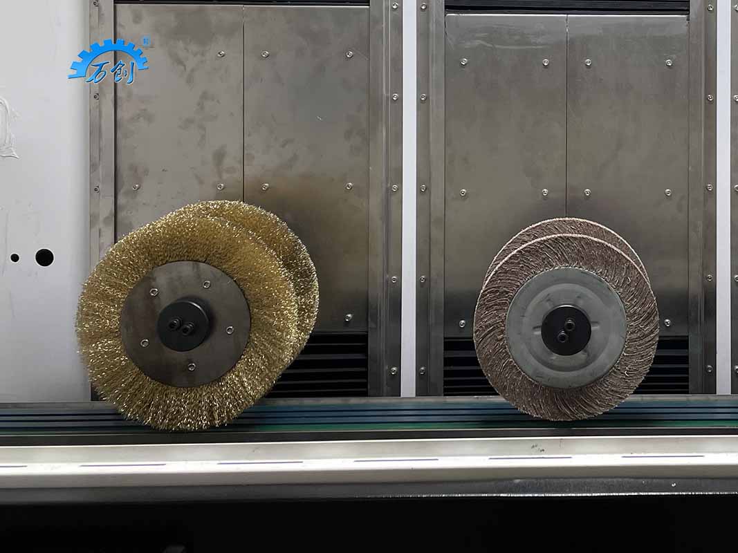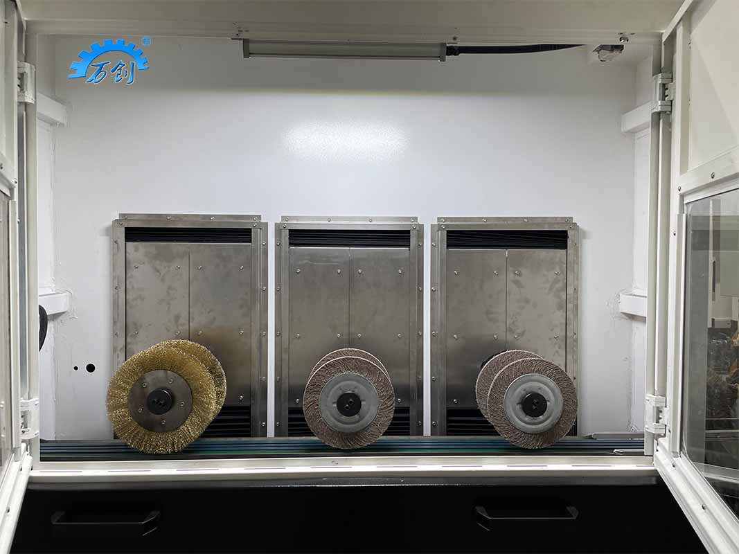 1.三工位打磨機(jī)構(gòu)組合。第一、二組工位打磨機(jī)構(gòu)均由一支主軸帶動(dòng)兩只砂布輪,同時(shí)打磨工件折彎凹陷處,去除翻邊毛刺;兩組砂布輪轉(zhuǎn)向相反,確保去毛刺無死角。第三工位打磨機(jī)構(gòu)由一支主軸帶動(dòng)兩只鋼絲刷,去除殘留粉塵以及微小毛刺。